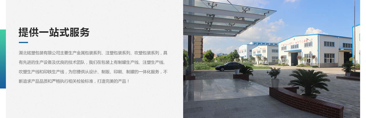 湖北銘塑包裝有限公司一家集研發(fā)、生產(chǎn)、銷售于一體的較優(yōu)秀民營企業(yè),技術(shù)力量雄厚,產(chǎn)品質(zhì)量可靠。位于交通暢順,百業(yè)興旺、經(jīng)濟富裕、政策開放的孝感開發(fā)區(qū)域。我們企業(yè)的營銷戰(zhàn)略是以建筑為土壤,以產(chǎn)品為種子,以質(zhì)量為肥料,讓綠色鋪滿全球。憑借多年來的行業(yè)經(jīng)驗,公司不斷進(jìn)行創(chuàng)新和研發(fā),為市場提供更廣泛的產(chǎn)品應(yīng)用領(lǐng)域和更好環(huán)保節(jié)能產(chǎn)品,為國家能源環(huán)保戰(zhàn)略和可持續(xù)發(fā)展戰(zhàn)略作出應(yīng)有的貢獻(xiàn)。 湖北銘塑包裝有限公司主要生產(chǎn)金屬包裝系列、注塑包裝系列、吹塑包裝系列,具有先進(jìn)的生產(chǎn)設(shè)備及優(yōu)良的技術(shù)團(tuán)隊,我們在包裝上有制罐生產(chǎn)線、注塑生產(chǎn)線、吹塑生產(chǎn)線和印鐵生產(chǎn)線,為您提供從設(shè)計、制版、印刷、制罐的一體化服務(wù),不斷追求產(chǎn)品品質(zhì)和嚴(yán)格執(zhí)行相關(guān)檢驗標(biāo)準(zhǔn),打造更好的產(chǎn)品!